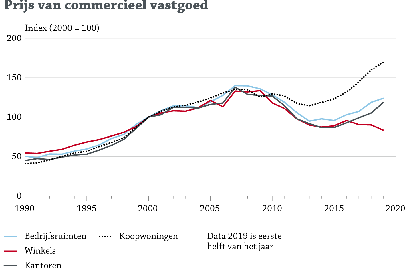 In de eerste helft van 2019 zijn de prijzen van kantoren en bedrijfsruimten gestegen met respectievelijk ruim 13 en 5 procentpunt ten opzichte van 2018.