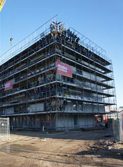 Het hoogste punt van appartementengebouw Contrabas in het nieuwste gedeelte van de Muziekwijk in Zwolle is vorige week bereikt.